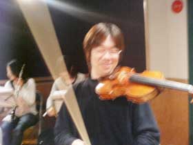 弓も震えるバイオリンの柳原祐弥。力量もセンスも抜群。岩崎宏美さんのツアーにも参加してくれて、ライブ・イマージュでは華麗なるダンシング(笑)もやってのける。この3人がプチオケの新しいお友だちだ! |